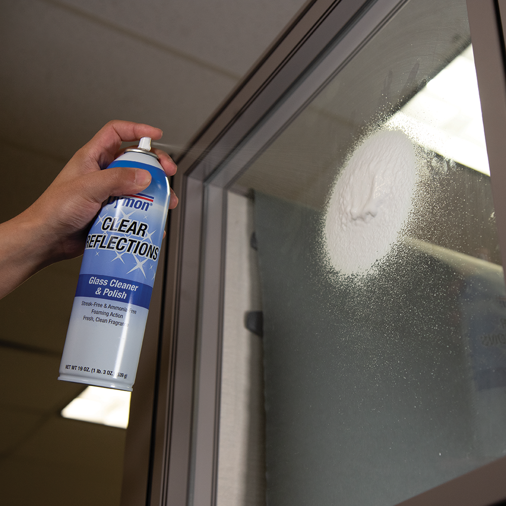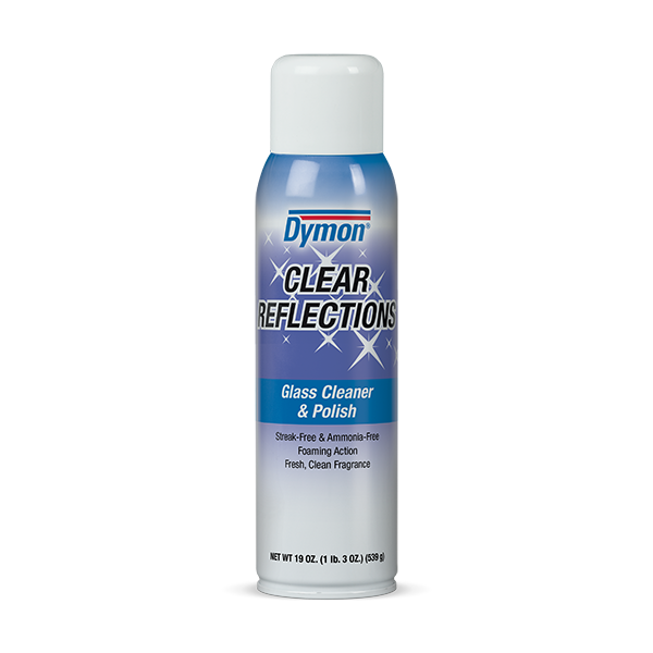 Dymon® CLEAR REFLECTIONS® has been uniquely formulated to create a residue-free glass cleaner that eliminates spots, film and streaks. It dissolves grease, oil, fingerprints, smudges and soils on contact. The overspray dries crystal clear, keeping just cleaned areas from having to be cleaned again. It leaves no spots, film or streaks, even at warm or cold temperatures.