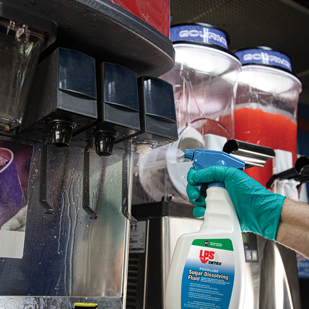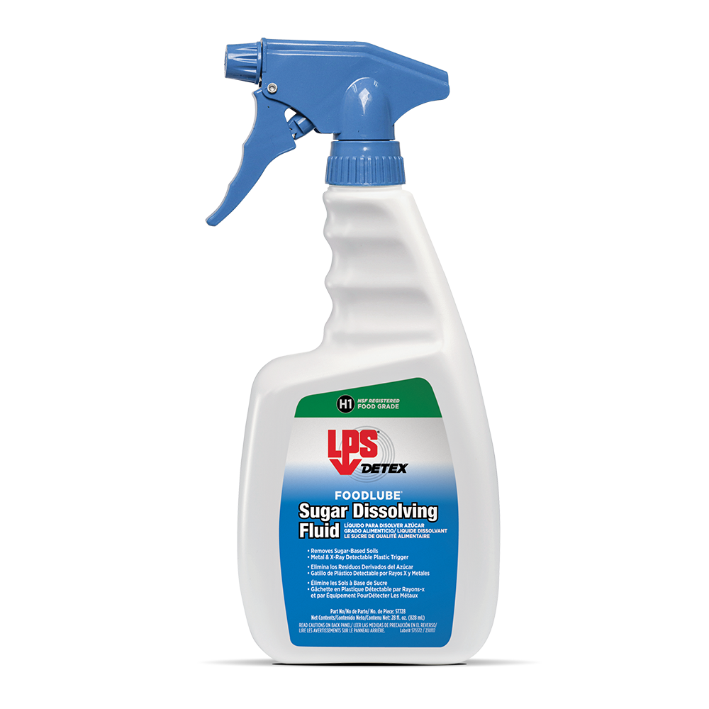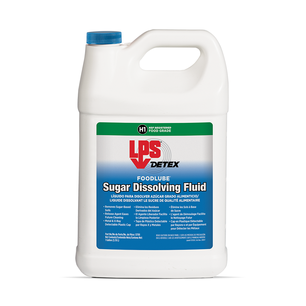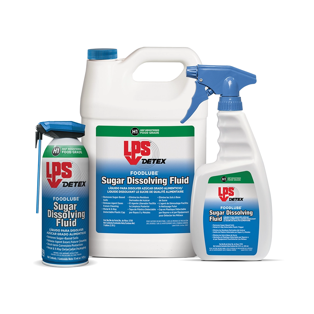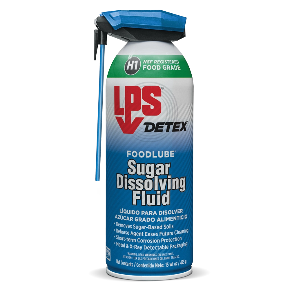 LPS® DETEX® FoodLube® Sugar Dissolving Fluid rapidly dissolves and removes sugar-based soils, keeping food and beverage equipment fully operational. This NSF H1 lubricant can be used anywhere within food processing facilities where incidental food contact may occur. The advanced formula leaves behind a thin lubricating film that eases future cleaning of sticky soils and provides short-term corrosion protection.