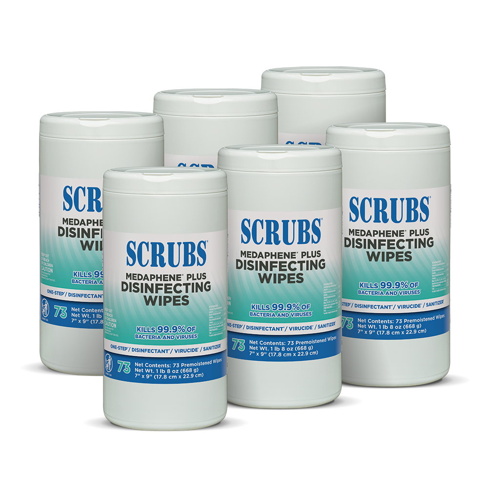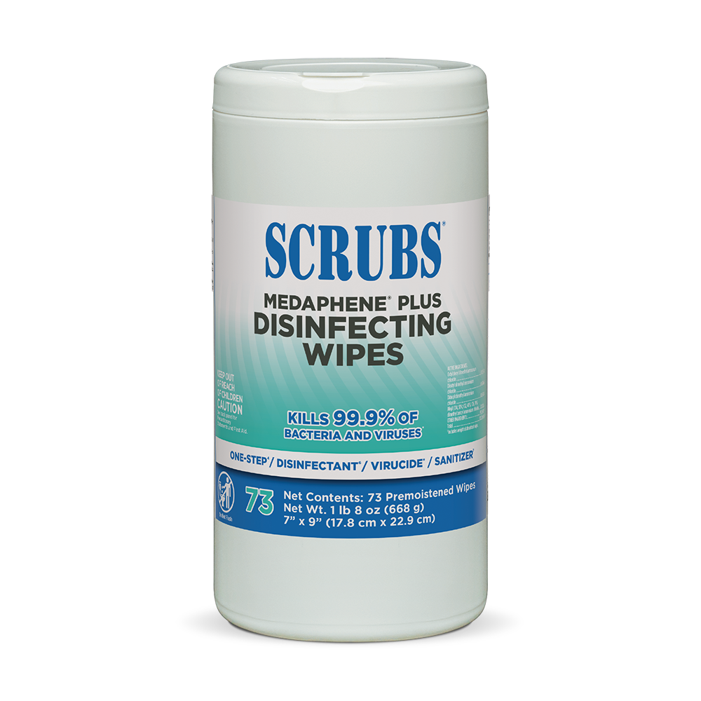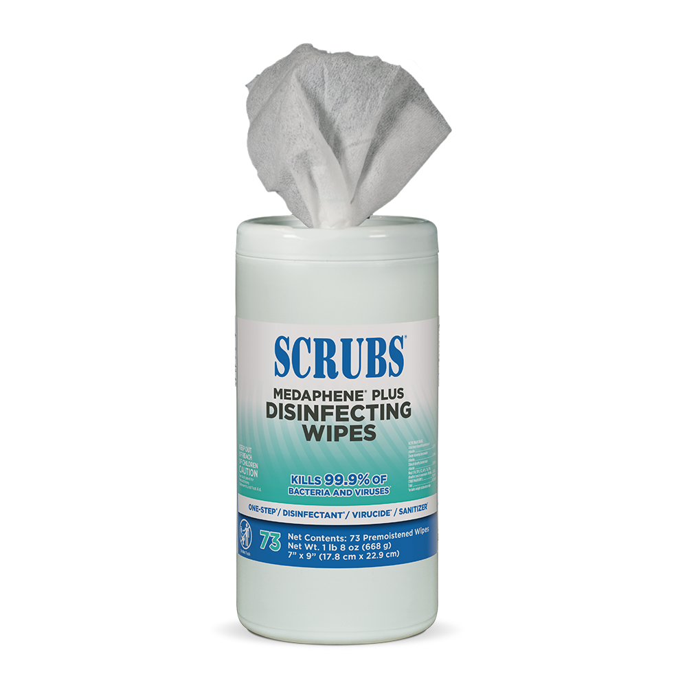 An effective germ-killing disinfectant combined with a strong wipe make up SCRUBS® MEDAPHENE® Plus Disinfecting Wipes. The textured wipe works quickly not only to loosen, but also absorb contaminants to leave surfaces clean and disinfected.