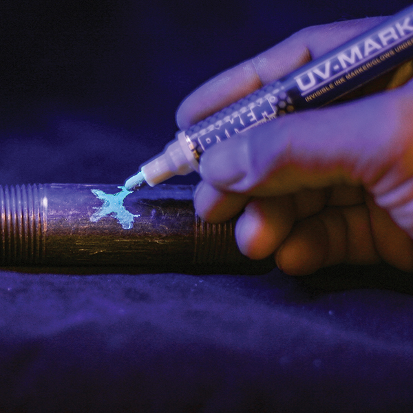 Make a mark only you will know about. DYKEM® UV Marker goes on invisible but illuminates blue under a black light. The fiber tipped marker writes on virtually any nonporous surface including plastic, glass, metal and more. Great for Quality Control processes, tamper checks, tagging, ownership, anti-counterfeiting and much more.